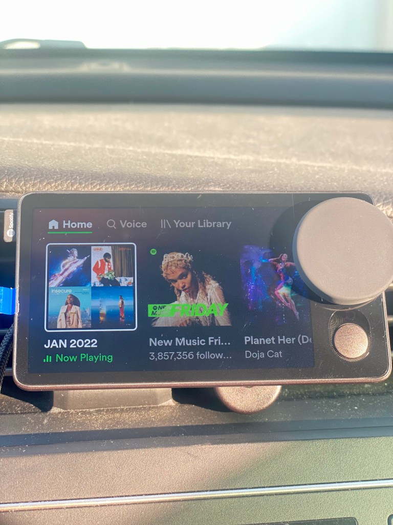 Also finally tested and installed this in my car yesterday – Spotify Car Thing. It’s literally called Spotify Car Thing lol Spotify’s car device. I got an email a month ago asking if I wanted to test it and so I said yes. It’s free for employees, and we just have to provide feedback on it. I think it’s pretty cool, and it’s a little smaller than my phone. I already have a screen that displays the music in my car so I basically have 2 screens now, but this device is voice activated. It’s basically Alexa/Siri, but Spotify.