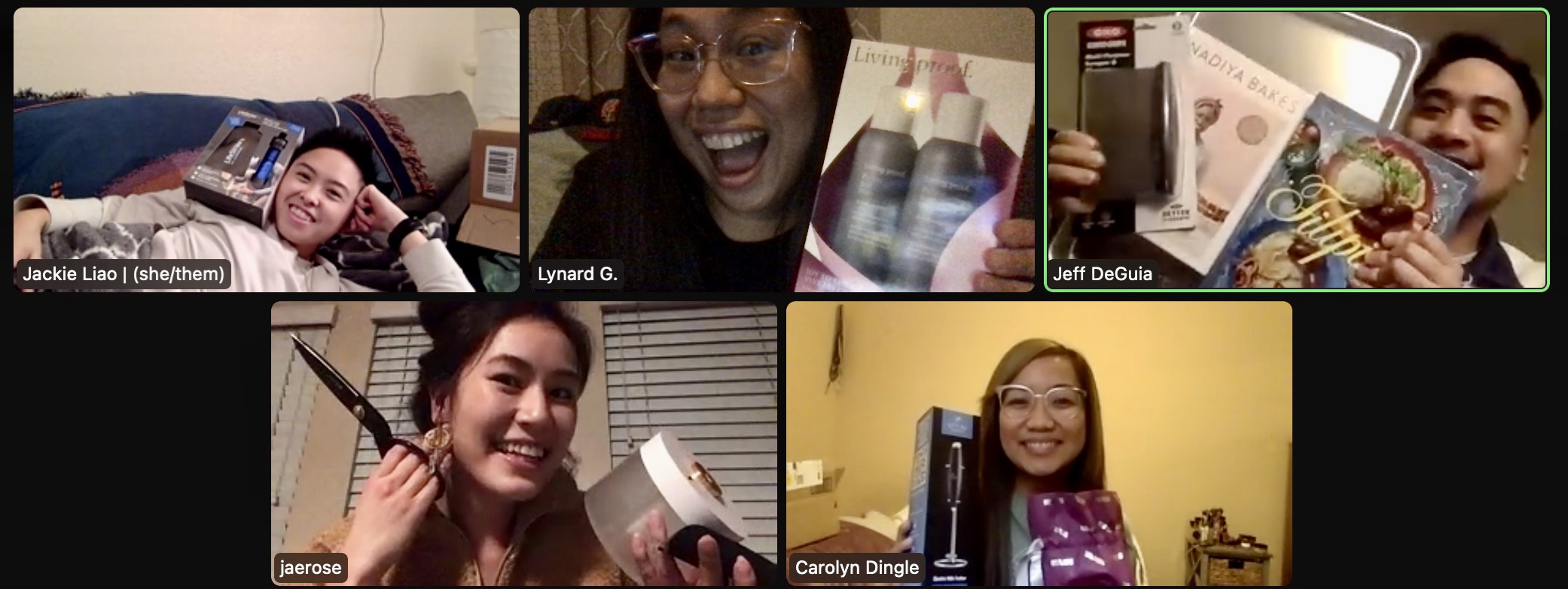 So tonight had a late Secret Santa exchange with Barkadas ❤️. We set a day to meet virtually and mailed our gifts to each other beforehand 🎁. This group is very special to me and includes my pledge sister Jackie, another Kappa sister Lynard, former roommate Jeff, and friend from CSULB/PAC Jessica. Jackie and I are in NorCal and Jess, Jeff, and Lynard are in SoCal. We all became close after working together for Fil-Am ARTS and helped organize the Festival of Pilipino American Arts and Culture (FPAC) in LA. We did already know each other from Kappa and PAC at CSULB, except for Jeff who we met through FPAC (yay lol).